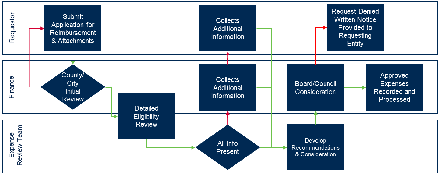 Concurrent to soliciting information from the broader community, counties and cities should work closely with their interdepartmental staff to establish knowledge of eligibility criteria, best practices for qualified expenses documentation and the development of a formal process for submitting expense payments or reimbursement requests for finance and Council/Commission approval.